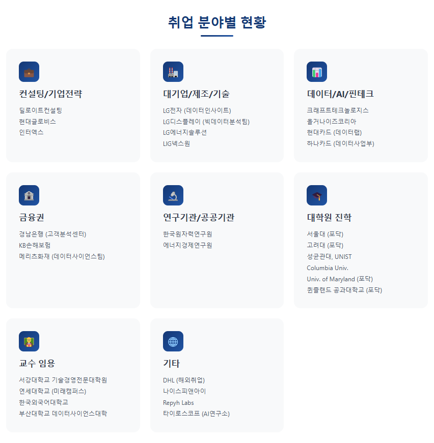 산업공학과 졸업생 취업현황(2025년 9월 기준) 2025.09.29 “산업공학과 졸업생들은 컨설팅, 데이터 사이언스, 제조, 금융, 연구기관, 대학원 등 다양한 분야에서 활약하고 있습니다.” “국내외 유수 기업 및 대학에 진출하며, 4차 산업혁명 시대의 핵심 인재로 성장하고 있습니다.”